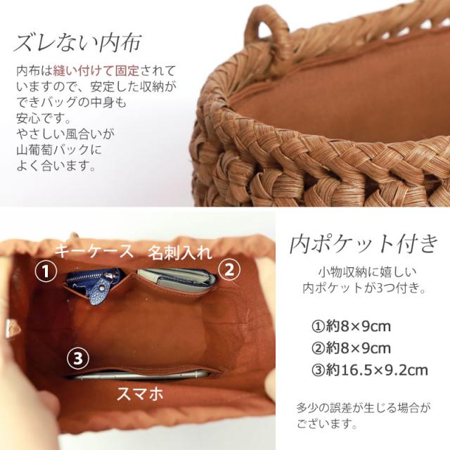 | 素材 | 鞄本体:天然山葡萄蔓 内布:綿100%(柿渋染め) |