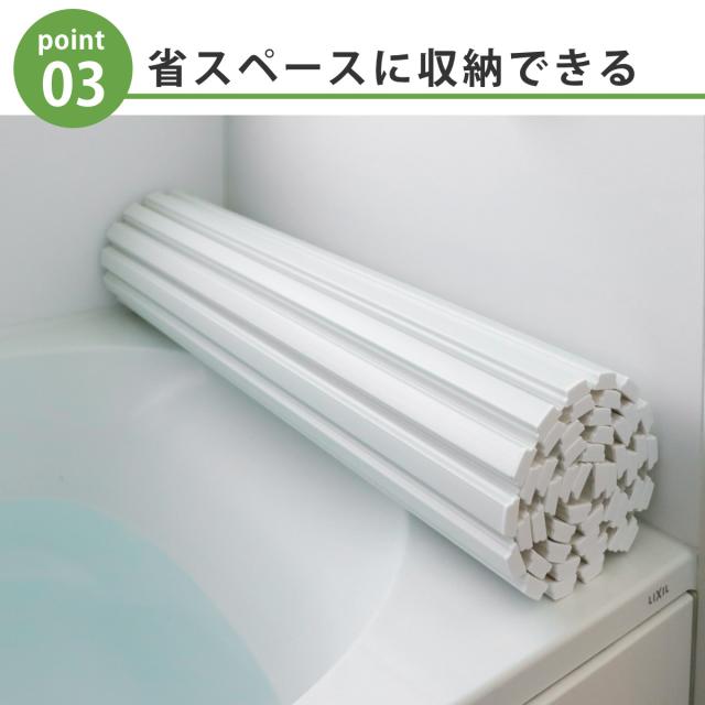 コンパクトに丸めて省スペースで収納ができるので、アパートなどの狭いお風呂にも最適です。また、浴室に立てかけての収納や、浴槽に寝かせての収納など、お好みに合わせて収納していただけます。