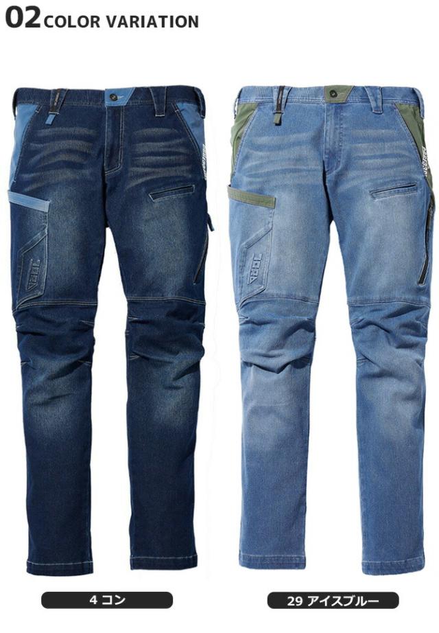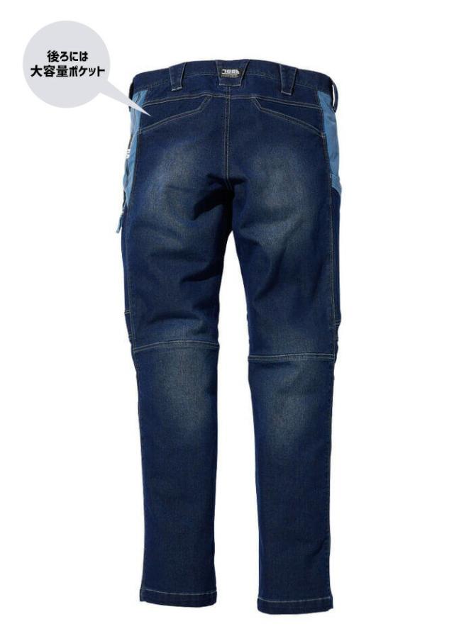 | 寅壱の伸縮率抜群の横伸びストレッチで動きやすいデニムカーゴパンツです。 遮熱機能を取り入れ、裏面点接触の肌触りが良いので、夏場のお仕事を快適にサポートします。 左カーゴポケットは止水ファスナー付きで、後ろポケットには大容量のスラッシュポケットを装備し、右脇に便利なカラビナループが付いています。 大胆な配色別布の組み合わせは斬新で目を引くポイントで、デザインの特徴と共に部分補強も兼ねています。 | ||||