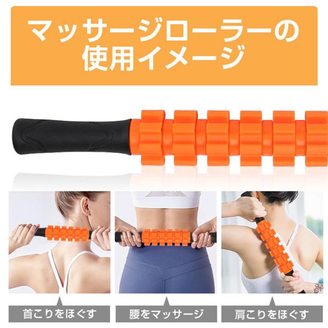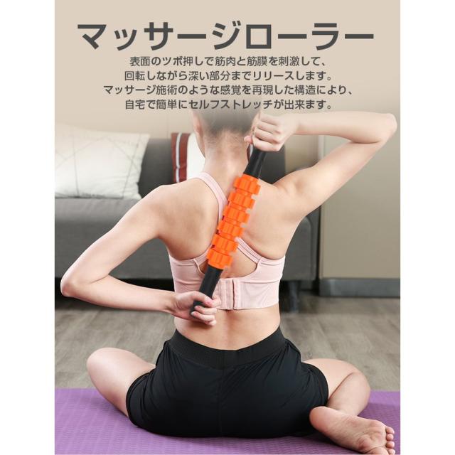 ローラースティックを使って首周り・背中・腰・肩などの硬い筋肉やほぐしたい部位にマッサージして、日頃の運動不足解消や疲労に効果が出ます。