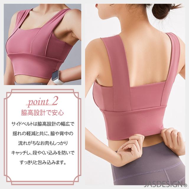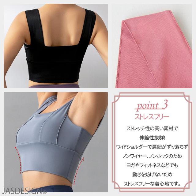 ストレッチ性の高い素材で伸縮性抜群!ワイドショルダーで肩紐がずり落ちずノンワイヤー、ノンホックのためヨガやフィットネスなどでも動きを妨げないためストレスフリーな着心地です。