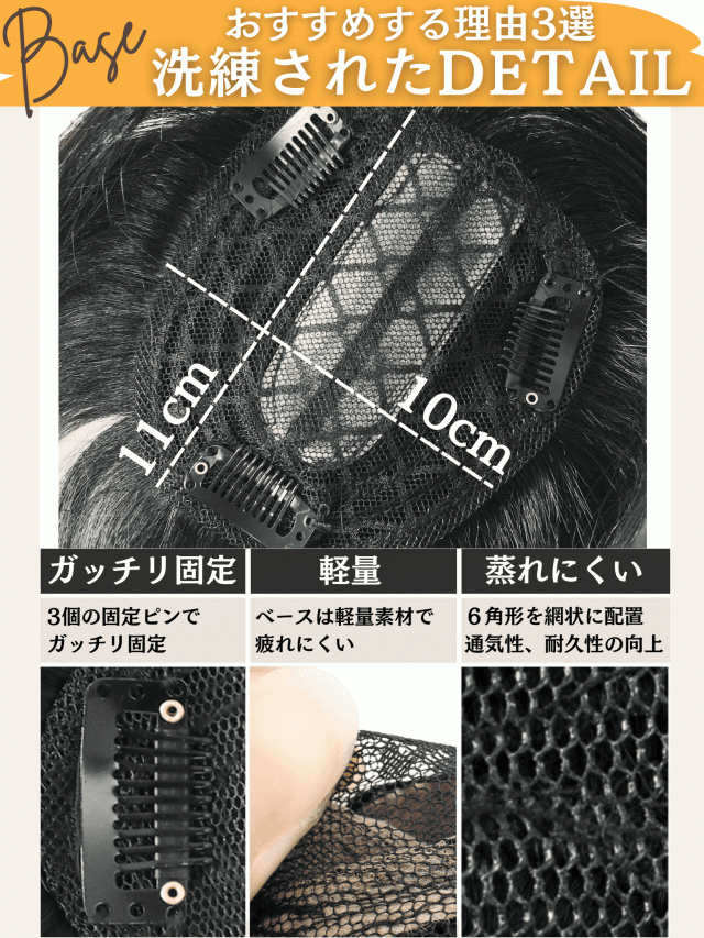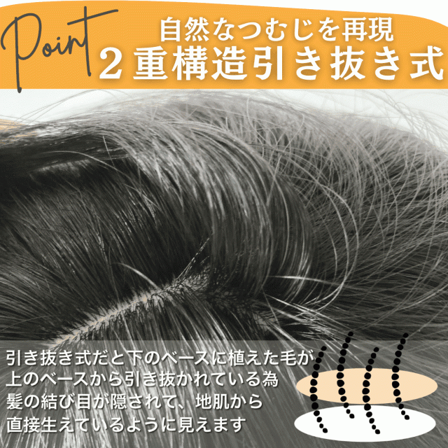 | 特徴2 | 植毛方法にもこだわり、二重構造&引き抜き式を採用。ナチュラルなI型つむじを実現 |