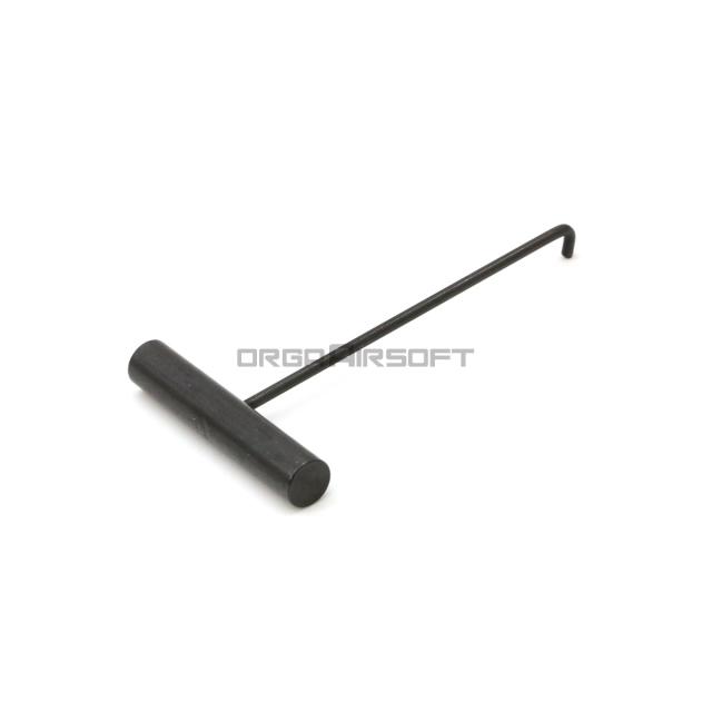 かぎ状になったツールの先端をストックのラッチの穴にレバーを引きながら引っ掛けます。(レバーを引きながらでないとラッチの穴と抜け防止ピンの間に隙間が生まれません)あとはツールを下の引けば容易にラッチを限界まで下げることができるので、そのままストックパイプから引き抜いてください。