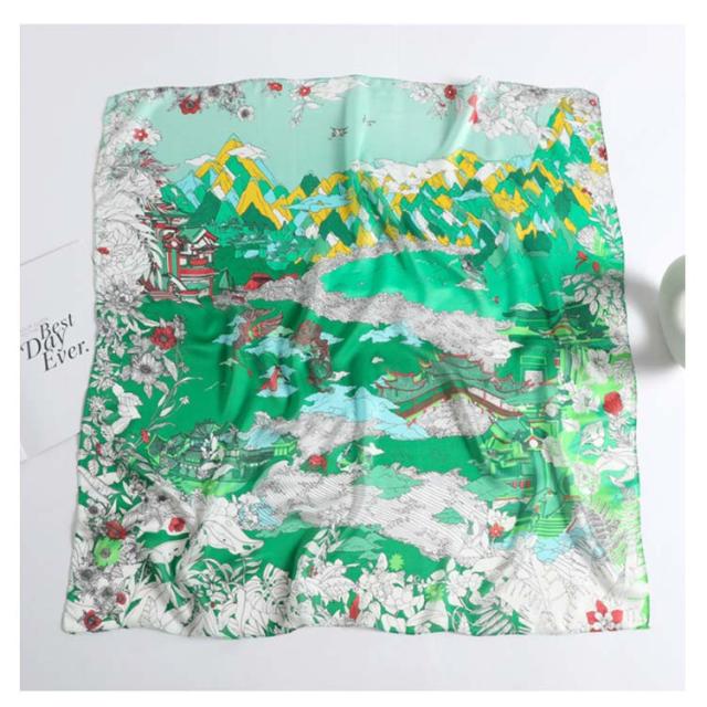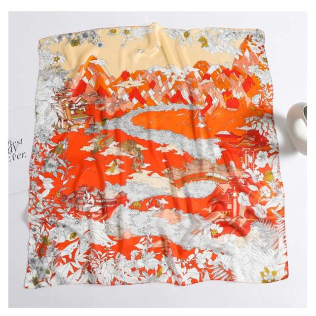 | 正方形の万能スカーフ。 辺約90cmの大判サイズなので、ストールやベルトがわりにしてみたり、バッグに結んだり、アレンジ自由自在でオシャレの幅が広がります。 ストール・ショールのようにも使えます。 シルクタッチのある滑らかな生地です。 | |