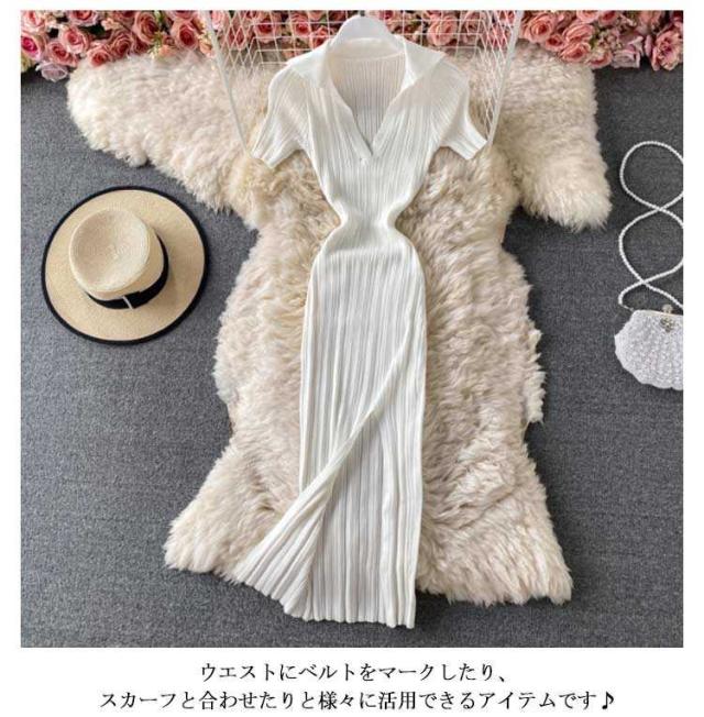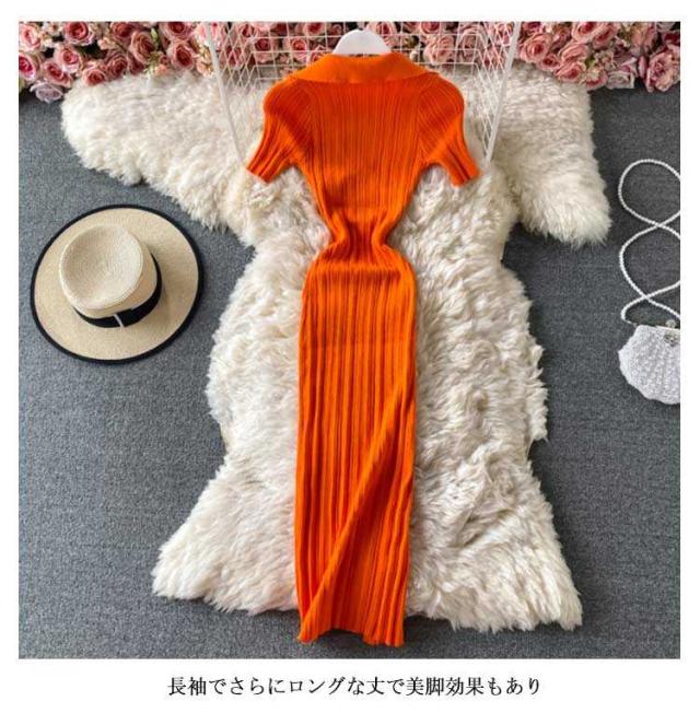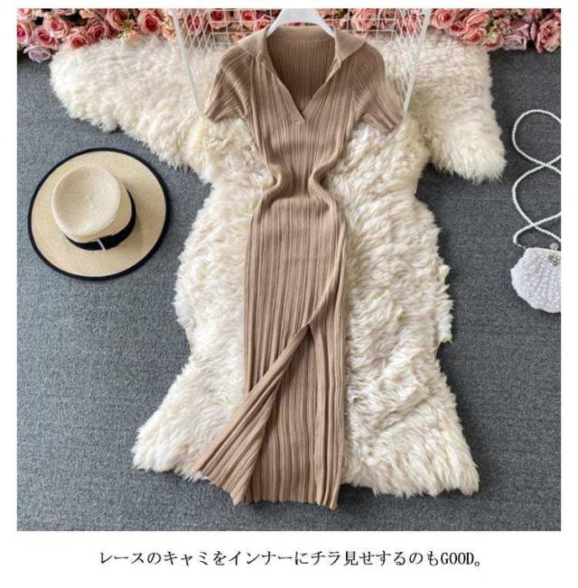 膝丈 タイト 半袖 タイトリブワンピース ニットワンピース Vネック ひざたけ フロントスリット 膝丈 ロング 秋冬 春秋 リブニット セクシー ロングワンピース