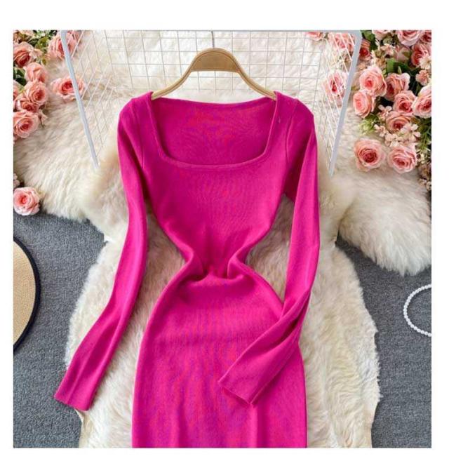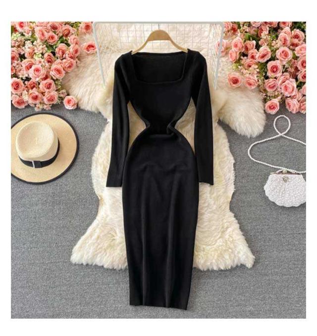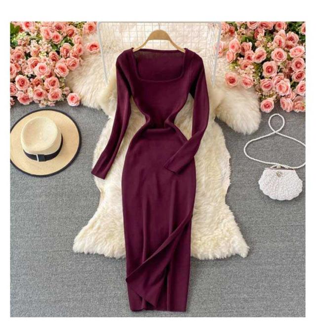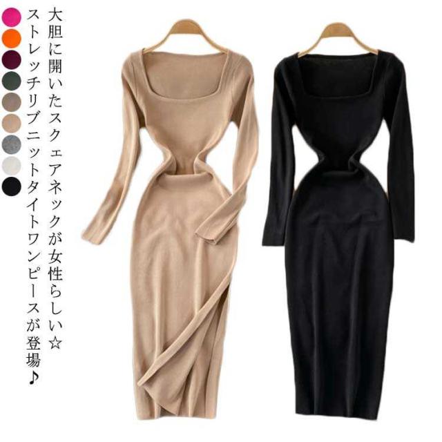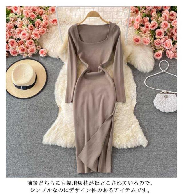 膝丈 ロングニットワンピース タイトワンピース ロングニットワンピース タイトニットワンピース タイトニット 長袖 ニットワンピース スクェアネック タイト スリット ひざたけ 秋冬 春秋 ニット ロング丈