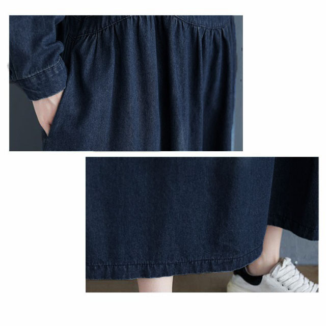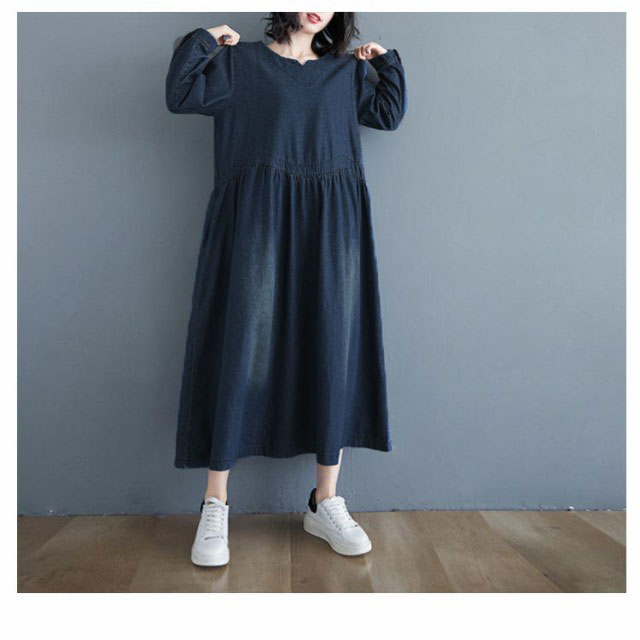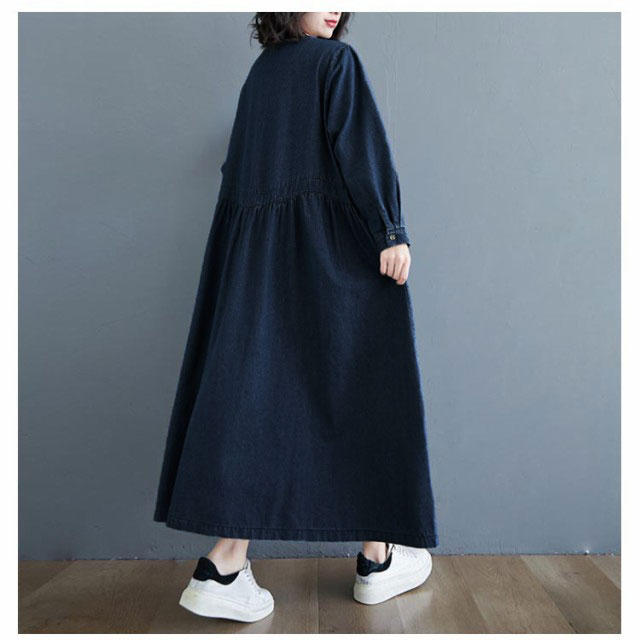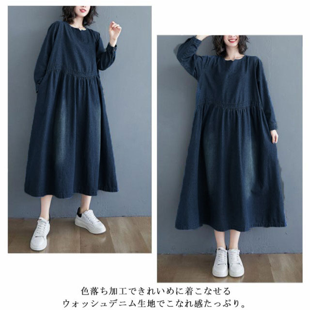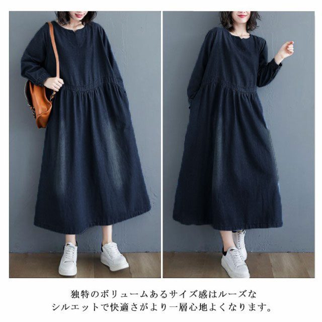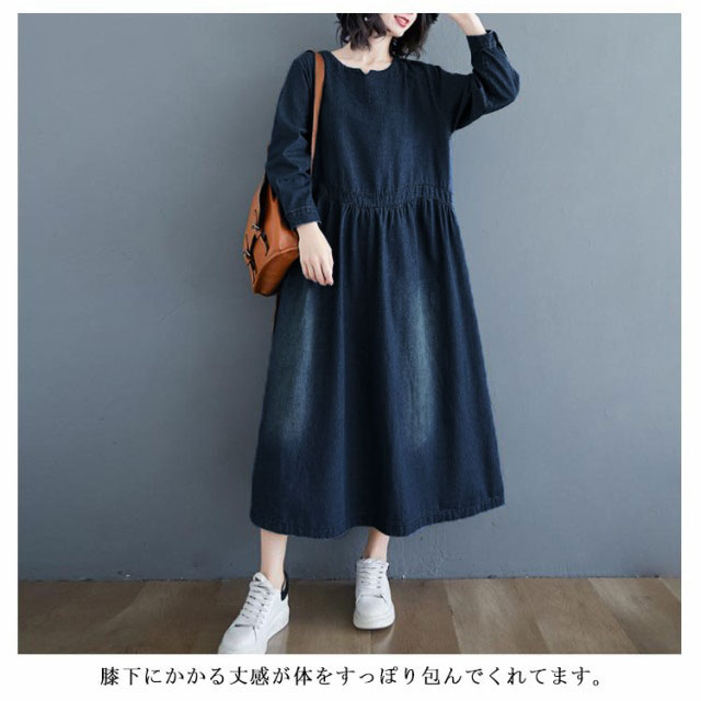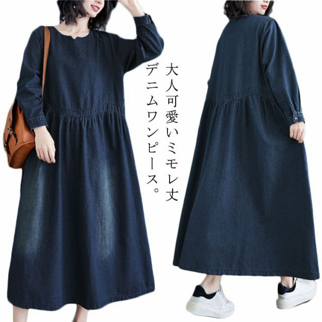 デニムワンピース ワンピース デニム 長袖ワンピース 大きサイズ カジュアルワンピース ミモレ丈 膝下丈 ゆったり 体型カバー 春 秋 送料無料