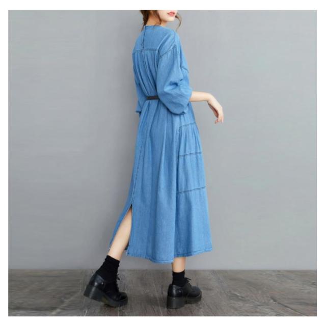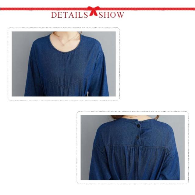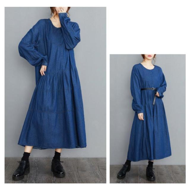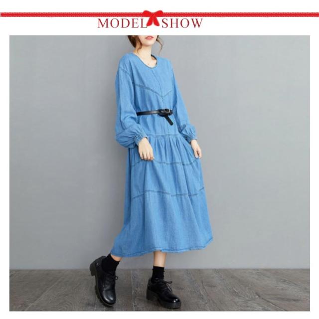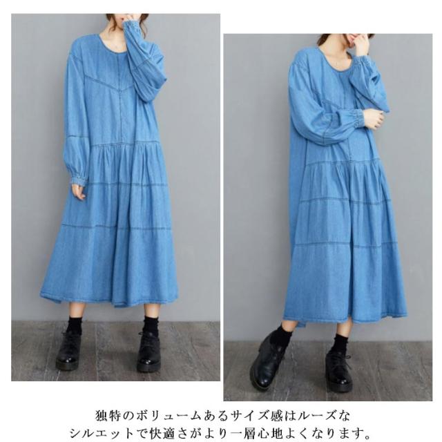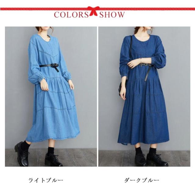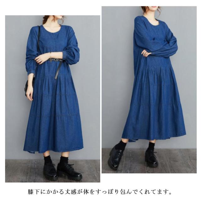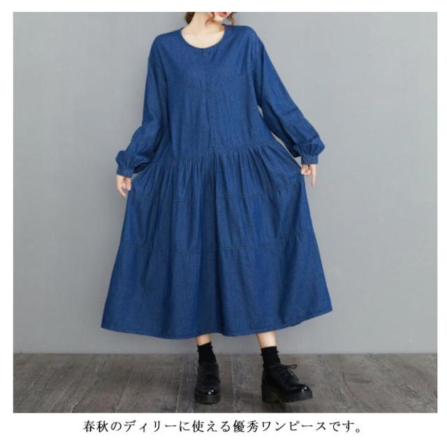 デニムワンピース フレアワンピース デニム 長袖ワンピース プリーツワンピース 大きサイズ カジュアルワンピース ミモレ丈 膝下丈 ゆったり 体型カバー 春 秋 送料無料