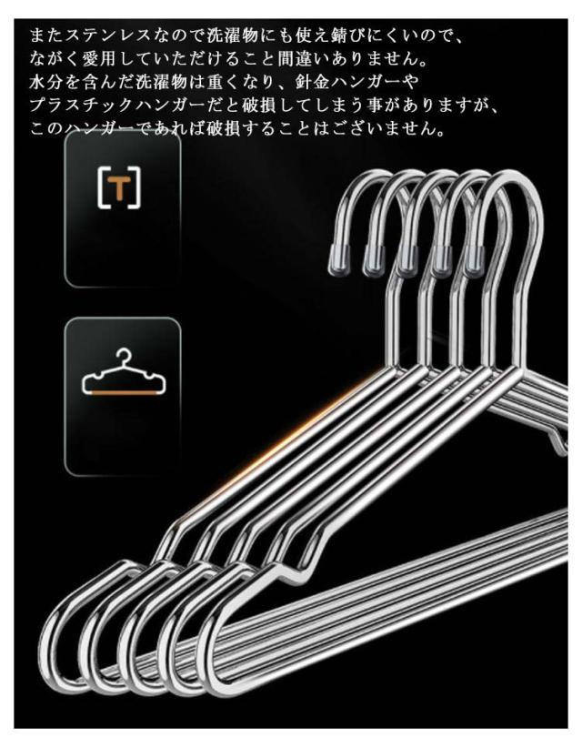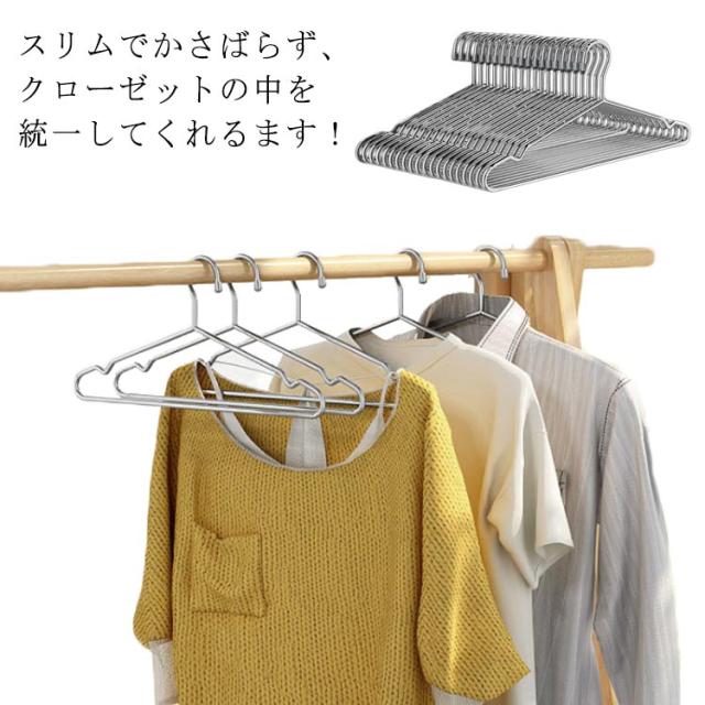 | スリムでかさばらず、クローゼットの中を統一してくれるます! 無駄なスペースを改善し、約20%程度のスペースを広げれます。 またステンレスなので洗濯物にも使え錆びにくいので、ながく愛用していただけること間違いありません。 水分を含んだ洗濯物は重くなり、針金ハンガーやプラスチックハンガーだと破損してしまう事がありますが、このハンガーであれば破損することはございません。 型崩れなども軽減でき、洋服も傷付きにくいです。 | |