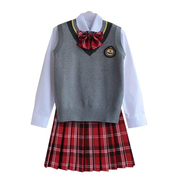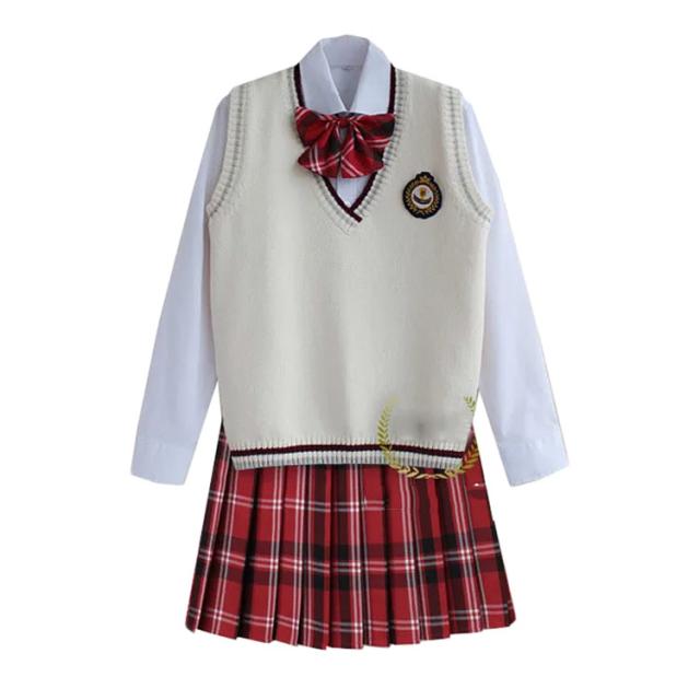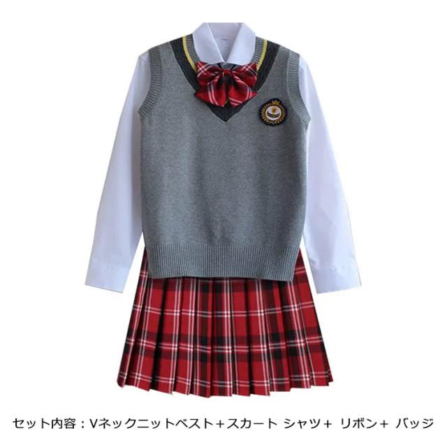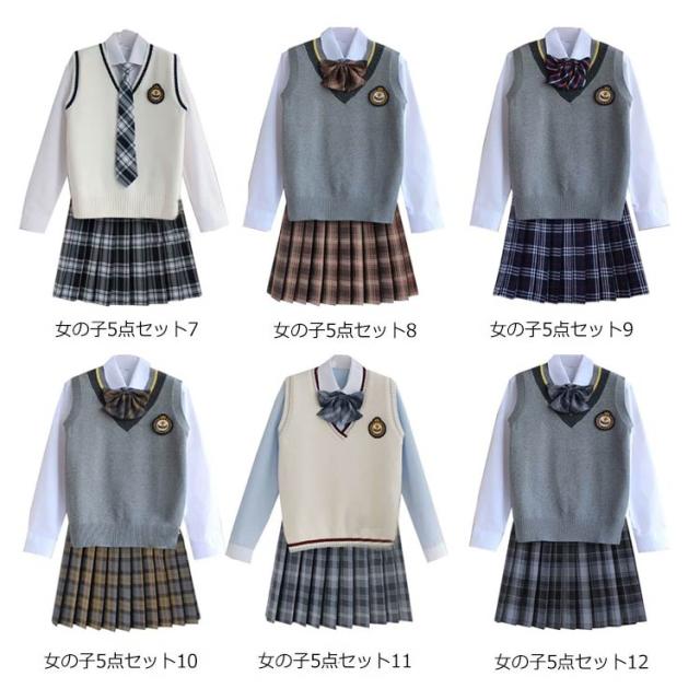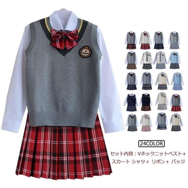 全24色 制服5点セット スカートスーツ 女子高生制服 フォーマルスーツ セットアップ Vネックニットベスト 卒業式 入学式 スーツ 女子制服 コスプレ コスチューム スクール ベスト スカート シャツ チェック柄 格子 セットアップ