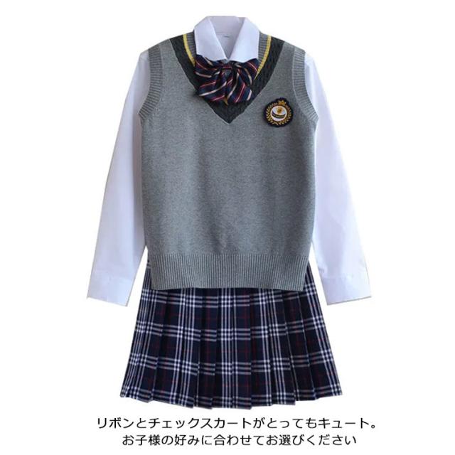 | セット内容:Vネックニットベスト+スカート シャツ+ リボン+ バッジ 豊富なチェック柄スカート選択可能ですが、お子様も楽に履いていただけます。 可愛らしさを演出するリボンは少し大きめで、留め具は強めに引っ張ると外れる安全仕様。 リボンとチェックスカートがとってもキュート。お子様の好みに合わせてお選びください | |