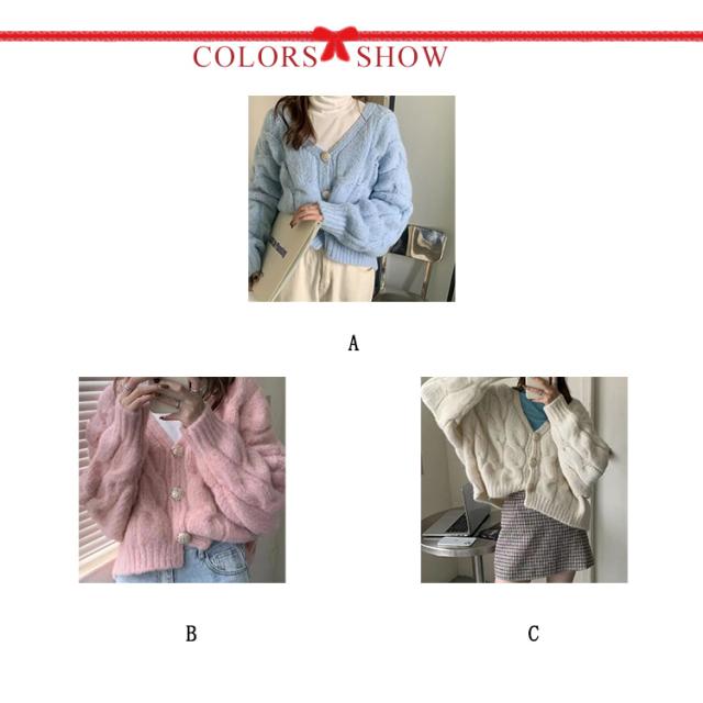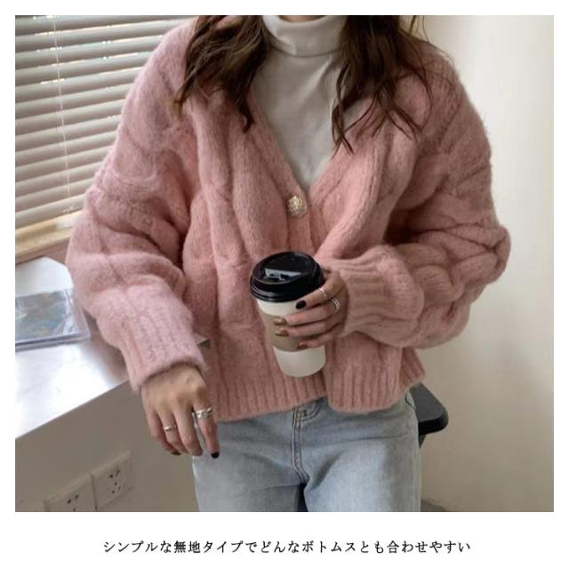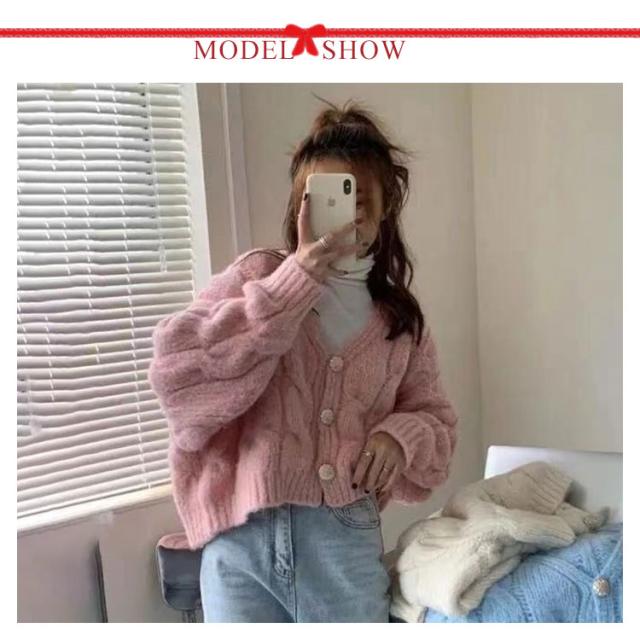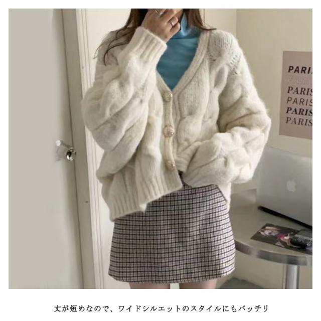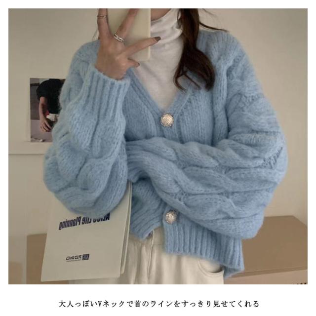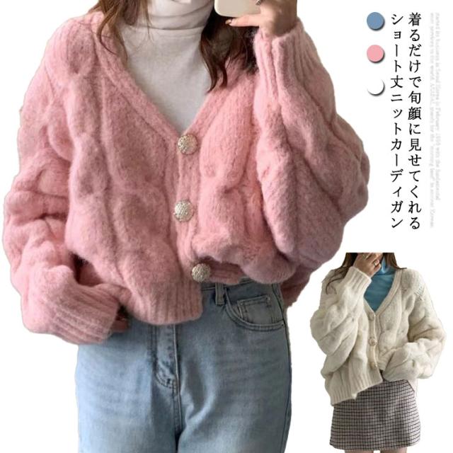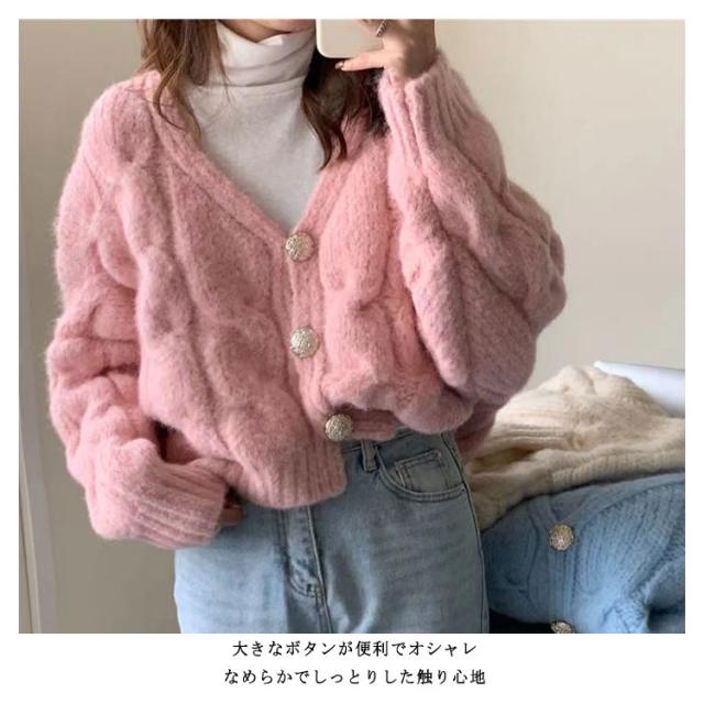 Vネック 長袖 ケーブル編み ショート ボタンカーディガン レディース コーディガン Vネック ニットセーター ニットトップス 春秋 春服 秋服 ニットカーディガン