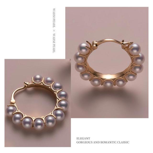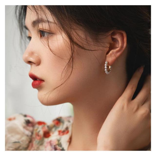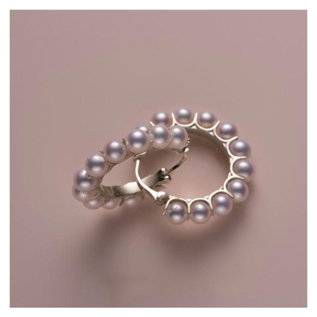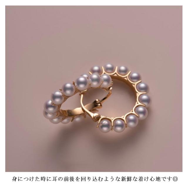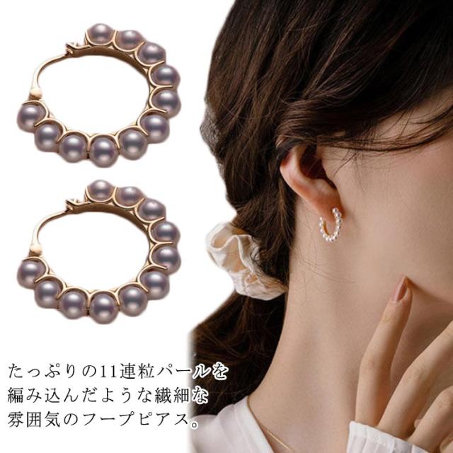 | たっぷりの11連粒パールを編み込んだような繊細な雰囲気のフープピアス。 モチーフとキャッチが一体になっているデザインだからキャッチの紛失がないのが嬉しいポイント。 身につけた時に耳の前後を回り込むような新鮮な着け心地です◎ | |