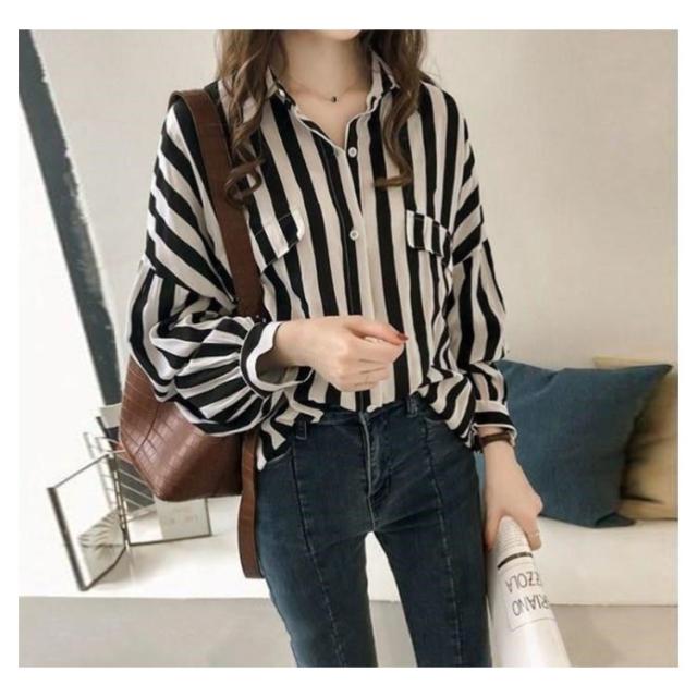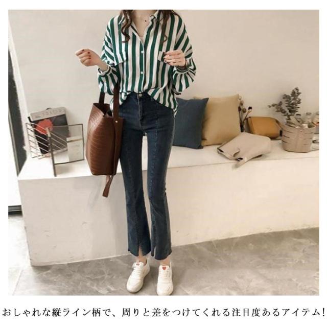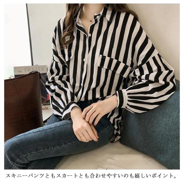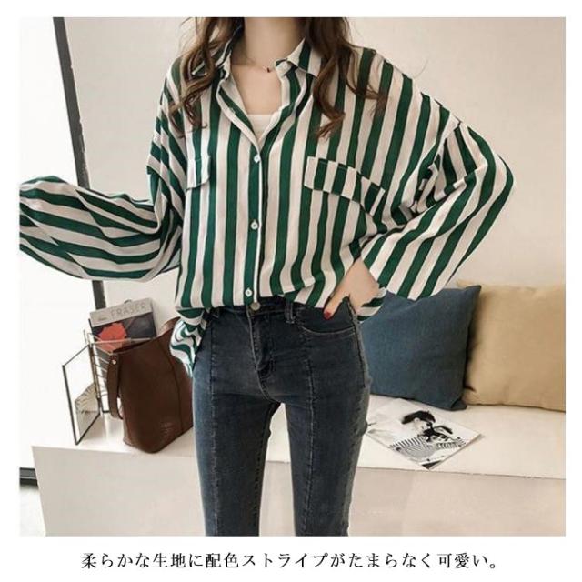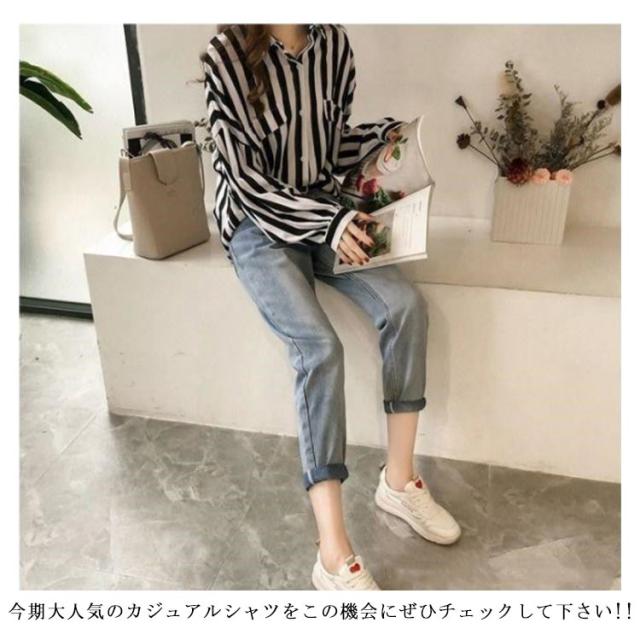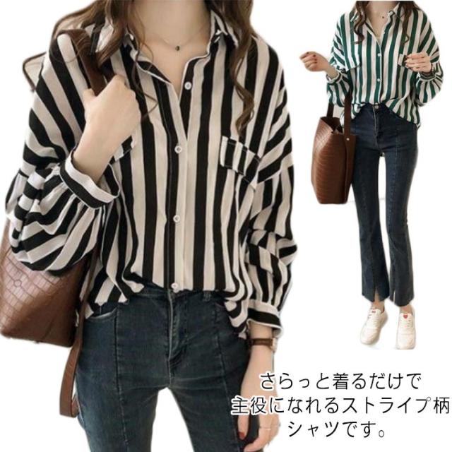 カジュアルシャツ シャツ 前開き ブラウス ゆるシャツ ゆったり 春物 レディース ストライプ柄 ミドル丈 長袖シャツ 春服 大きめ シンプル 可愛い 通勤 OL 大人 春夏 夏 春物 秋服