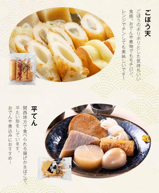 ごぼう天:魚肉(輸入又は国産)、種もの(ごぼう)、砂糖、でん粉(小麦を含む)、揚げ油(なたね油)、食塩、ぶどう糖、卵白(卵を含む)/調味料(アミノ酸等)、保存料(ソルビン酸)