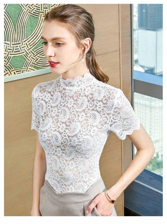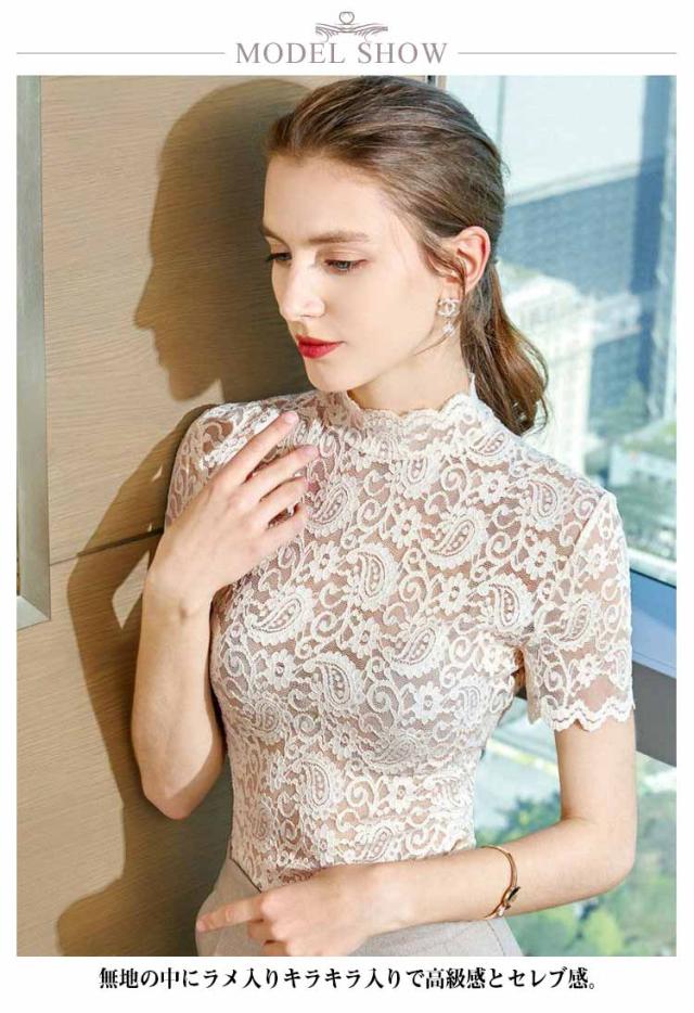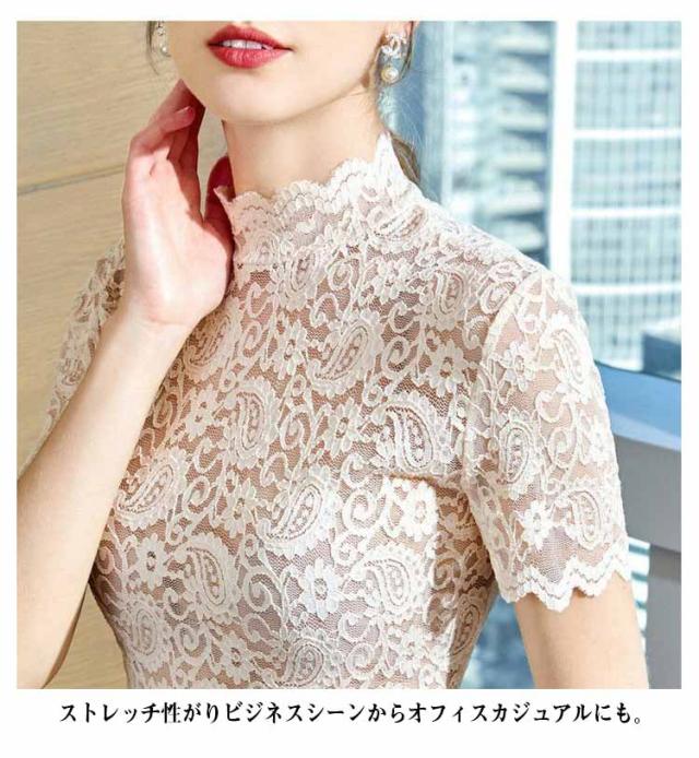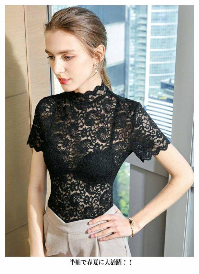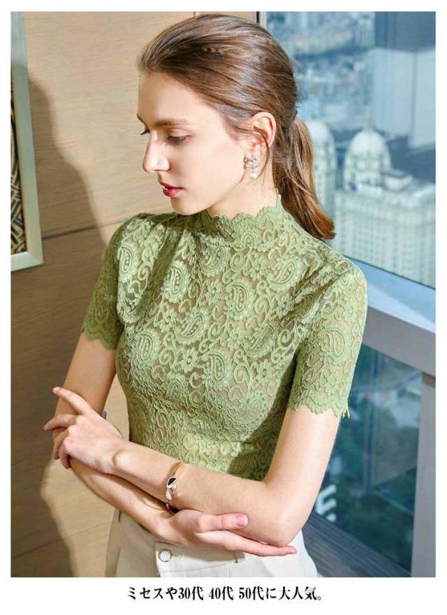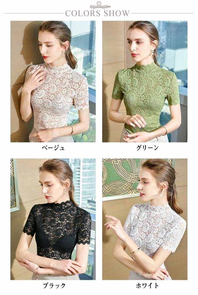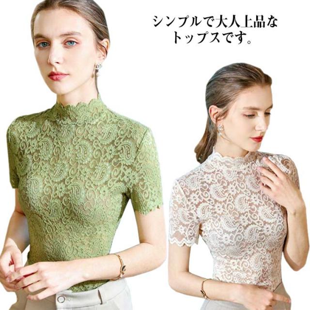 レースブラウス タートルネック ハイネック レディース トップス 半袖 レーストップス シースルー カットソー ブラウス インナー 夏 可愛い おしゃれ 大人 上品 きれい レース 春 秋 冬 オフィスカジュアル 通勤 ベージュ ホワイト グリーン ブラック
