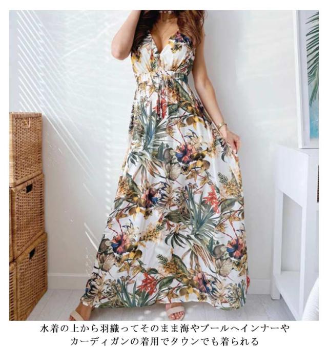 | 夏を満喫できること間違いなし大人可愛いサマーワンピース 品花柄で暑さを感じさせない。 さらりとして着心地良し。 大人エレガントなロングワンピ! 水着の上から羽織ってそのまま海やプールへインナーやカーディガンの着用でタウンでも着られる | |