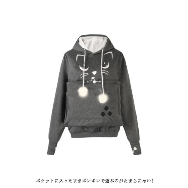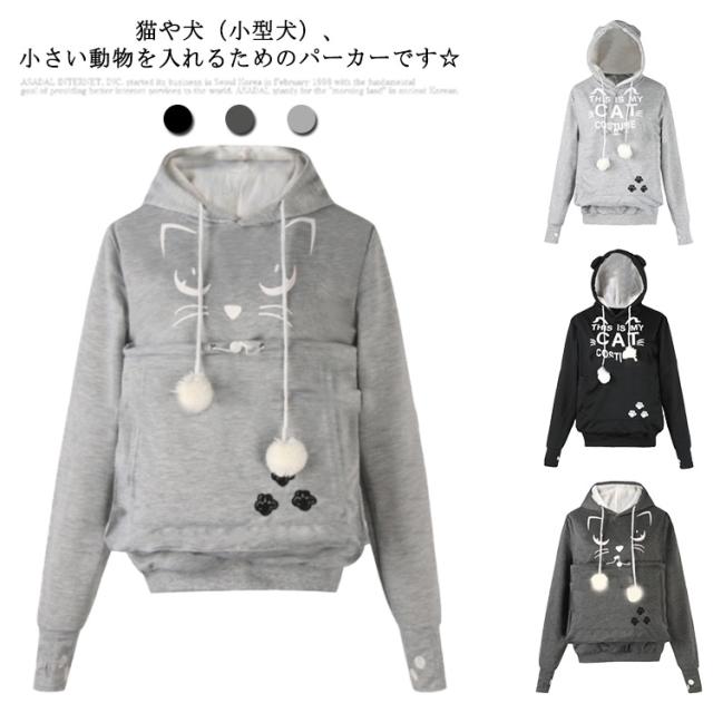 にゃんこポケット付き フリース パーカー にゃんパーカー 冬 春秋 猫耳フード付き トレーナー プルオーバー トップス メンズ レディース 猫 犬 小動物 散歩 便利