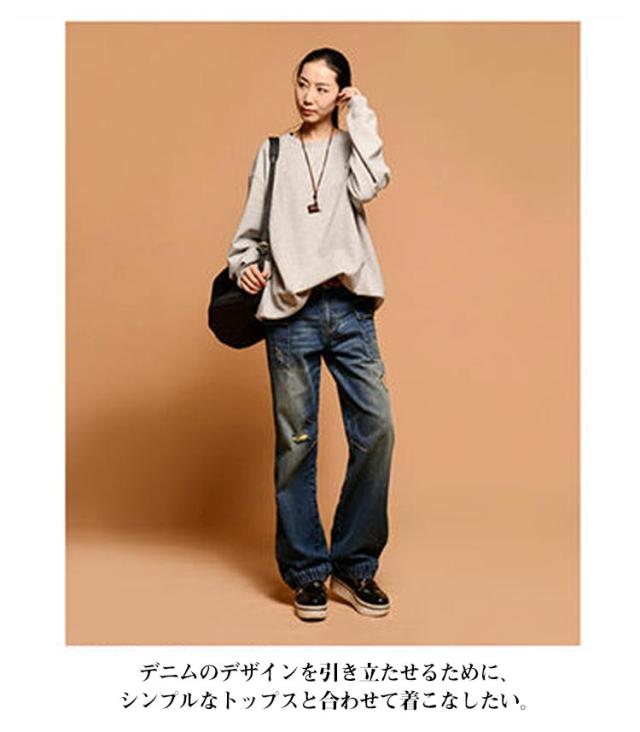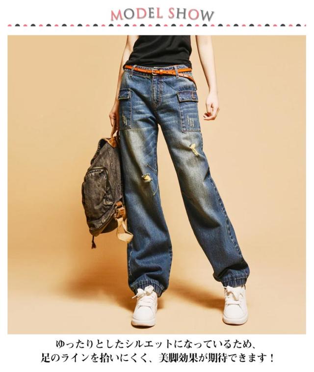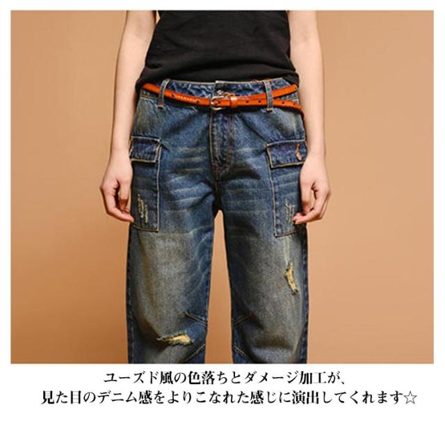 | こなれたダメージ感がポイントのデニムパンツ。 ゆったりとしたシルエットになっているため、足のラインを拾いにくく、美脚効果が期待できます! ユーズド風の色落ちとダメージ加工が、見た目のデニム感をよりこなれた感じに演出してくれます☆ デニムのデザインを引き立たせるために、シンプルなトップスと合わせて着こなしたい。 | |