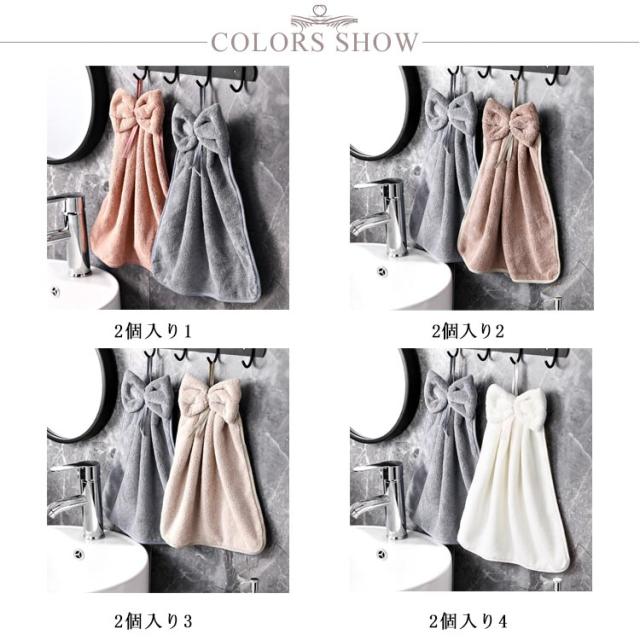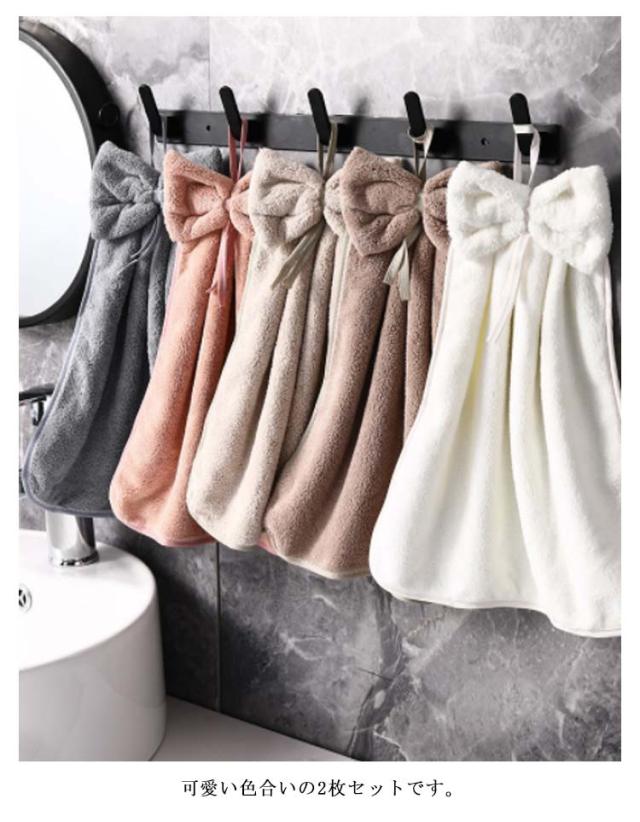 | キッチンや洗面所で使える、超吸収のキッチンタオルです。 先端が輪っかになっているのでフックのある場所なら、どこでも掛けることができます。 可愛い色合いの2枚セットです。 | |