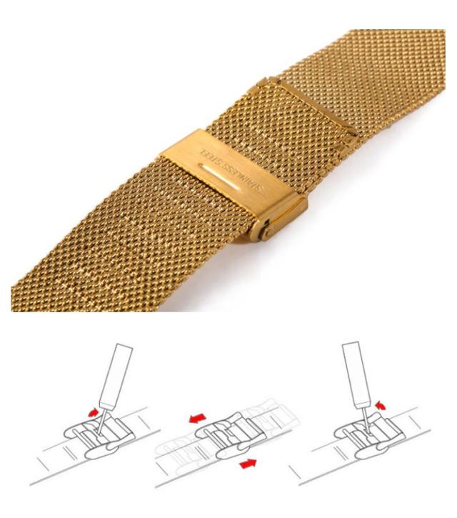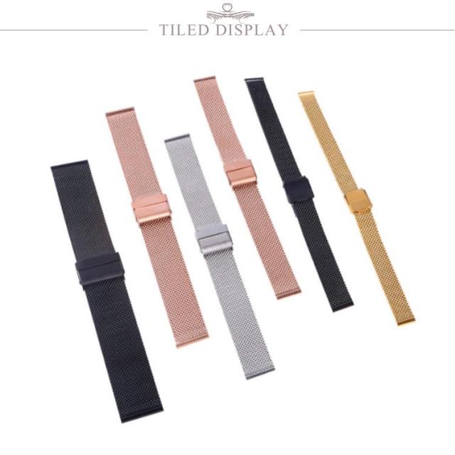 | 簡単にサイズ(長さ)調節のできる、ステンレススチールを使用したモデル。 シルバー、ゴールド、ピンク、ゴールド、ブラックのカラー展開の中からお使いの時計に合わせてお選びください。 | |