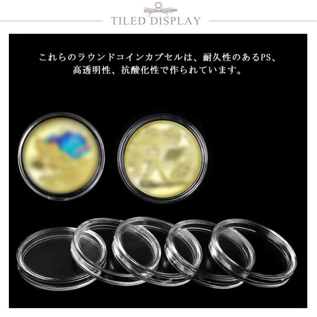 | 高品質の素材:これらのラウンドコインカプセルは、耐久性のあるPS、高透明性、抗酸化性で作られています。 多機能記念硬貨 ケース:国内はもちろん海外の記念コイン・金貨・銀貨の収納に最適です。 自身の趣味としてコイン、記念硬貨の整理とコレクションにも、コイン収集家に贈り物としても最適です。 | |