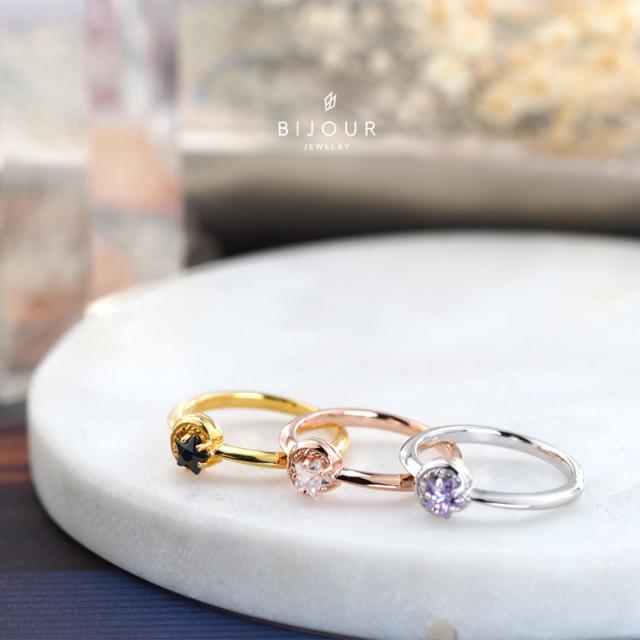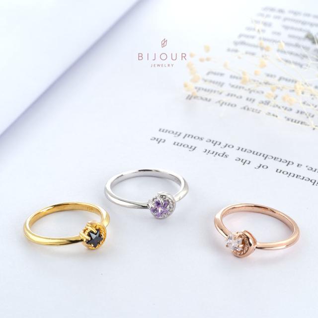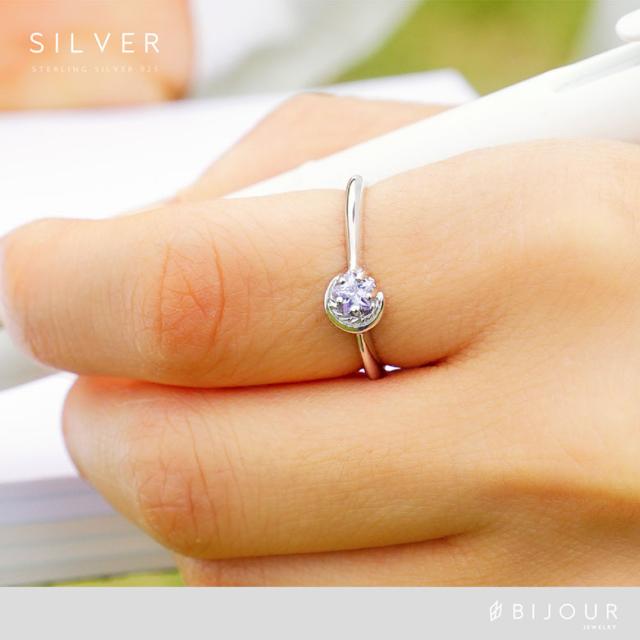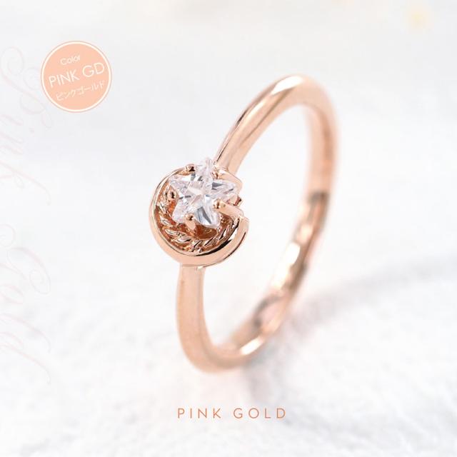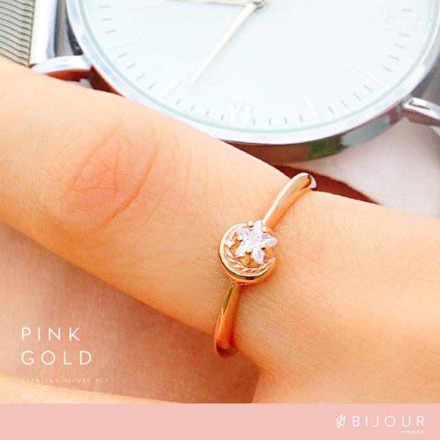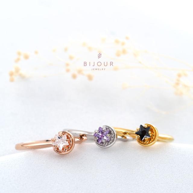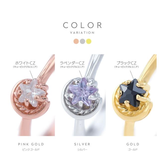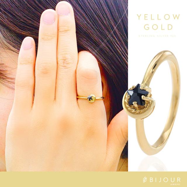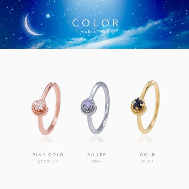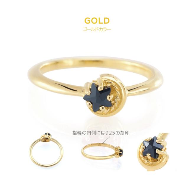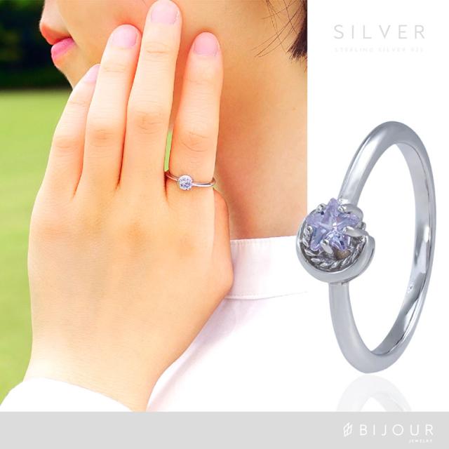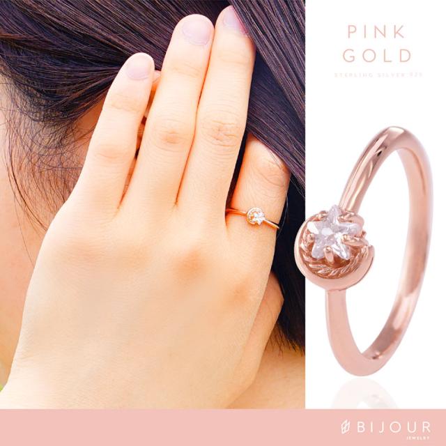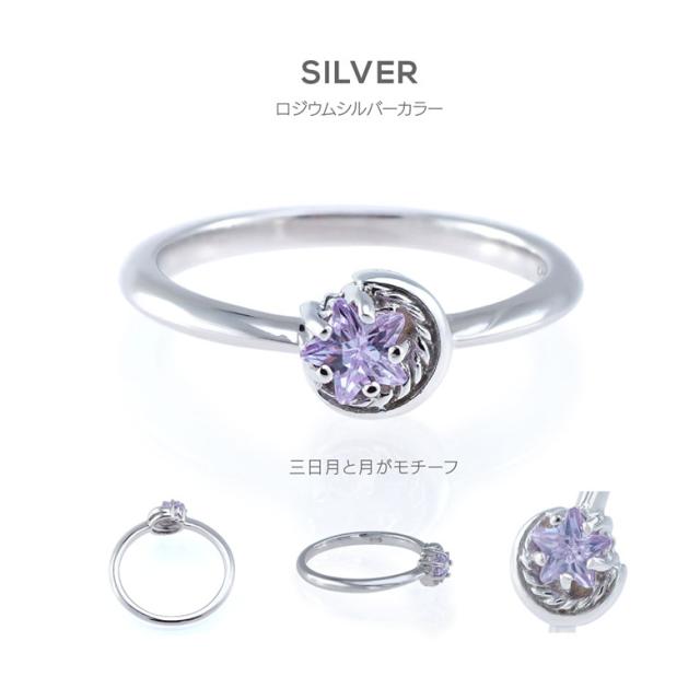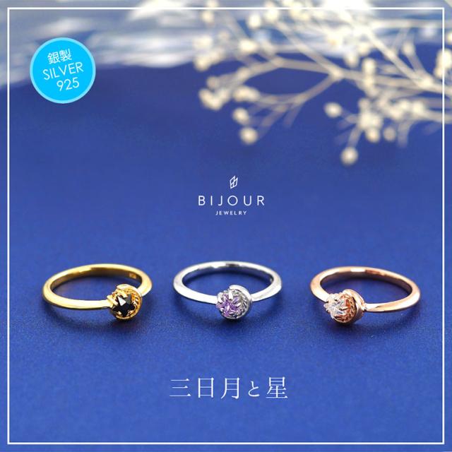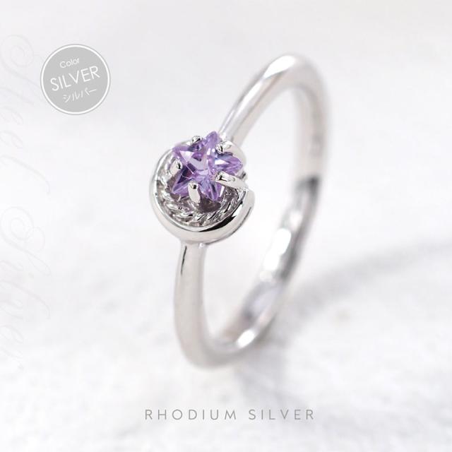 三日月と星をモチーフにしたシルバー925の指輪です。三日月に抱きかかえられるようにセットされた石は、星の形にカットされたジルコニア。細かいカッティングで指元でキラリ美しく輝きます。また、K18(18金ゴールド)、ロジウムコートでプラチナ仕上げをしたジュエリーコーティング仕様で、上質なシルバー925をジュエリーコーティングしているので、変色しにくく、アレルギーの心配も少なく使いやすいリングです。