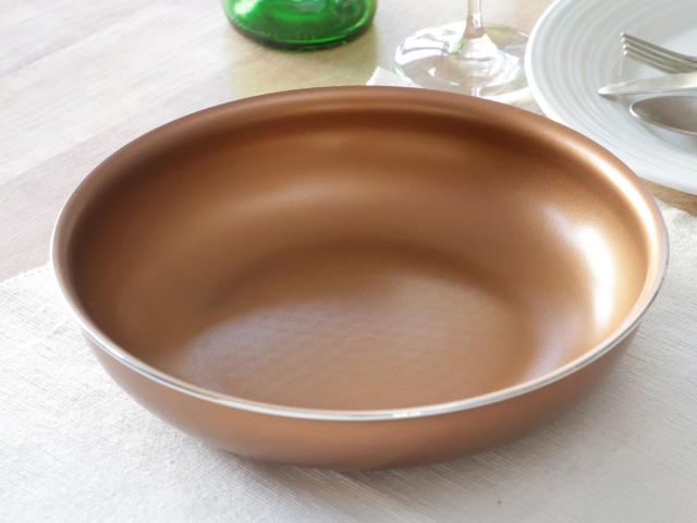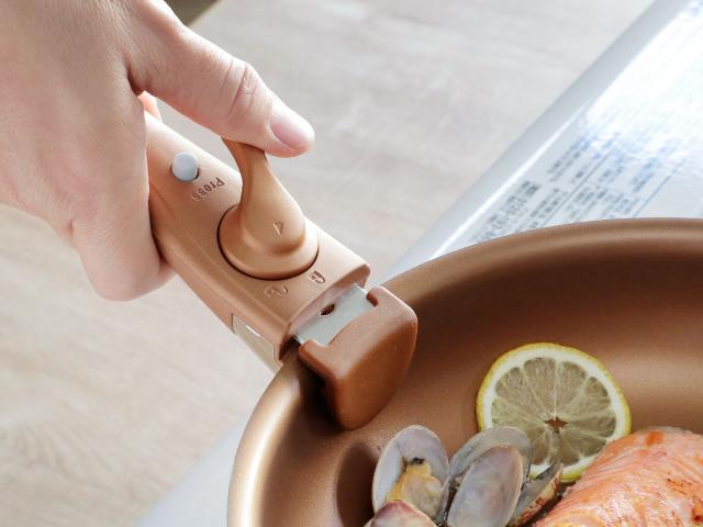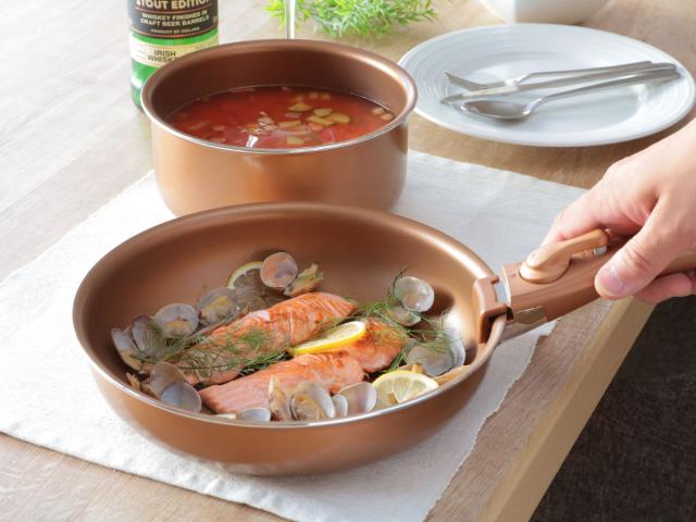 ハンドルを外して、フライパンのまま出来立てあつあつのお料理を食卓ヘ出すことができます。ゴールドカラーがテーブルに華を添えます。