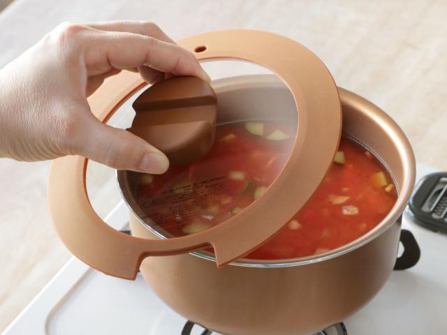 調理中に蓋をしたまま中の様子を確認できるガラス蓋付きです。つまみ部分におたまなどのキッチンツールが置ける仕様で、調理の合間に置けるので便利です。