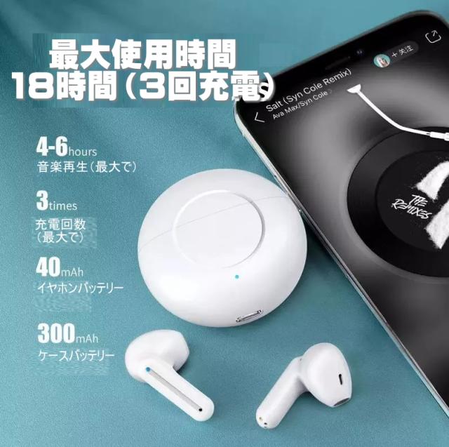 充電ケースのバッテリー300mAh最大100時間の待機、イヤホンの充電は約3回分。イヤホンは40mAhで音楽再生は最大で4〜6時間!(超軽量仕様)