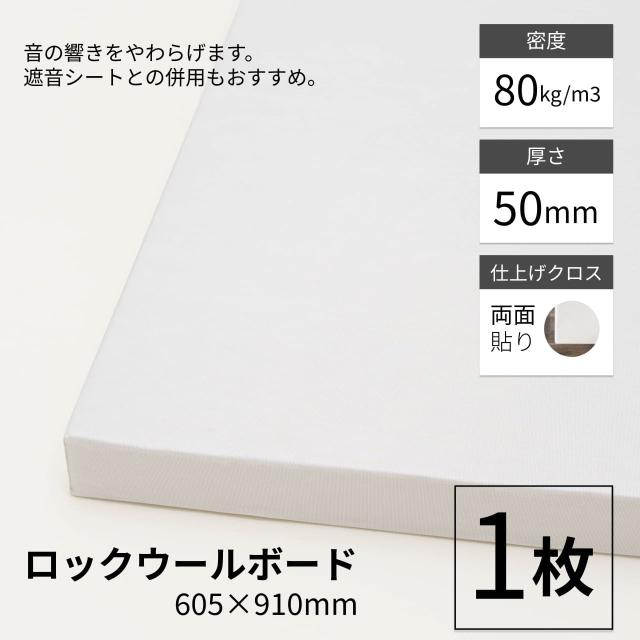 ロックウールボード 密度80kg/m3 ガラスクロス全面(両面)貼り 白 605×910mm 厚さ50mm 1枚 吸音材 防音パネル 防音ボード 吸音 防音 DIY 遮音 騒音対策 ピアリビング