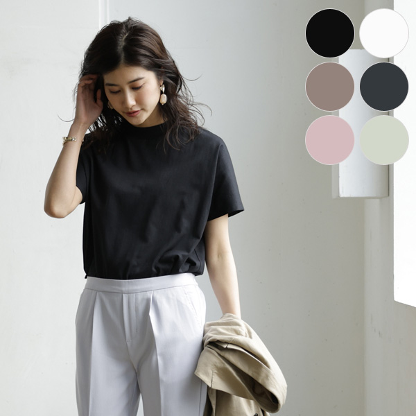 オフホワイト/ブラック/モカ/チャコール/ピンクベージュ/ミント/夏にうれしい機能付きプチハイネックTシャツ
