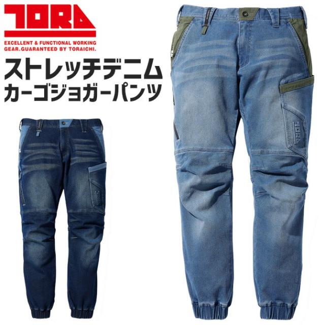 寅壱の伸縮率抜群の横伸びストレッチで動きやすいデニムカーゴジョガーパンツです。