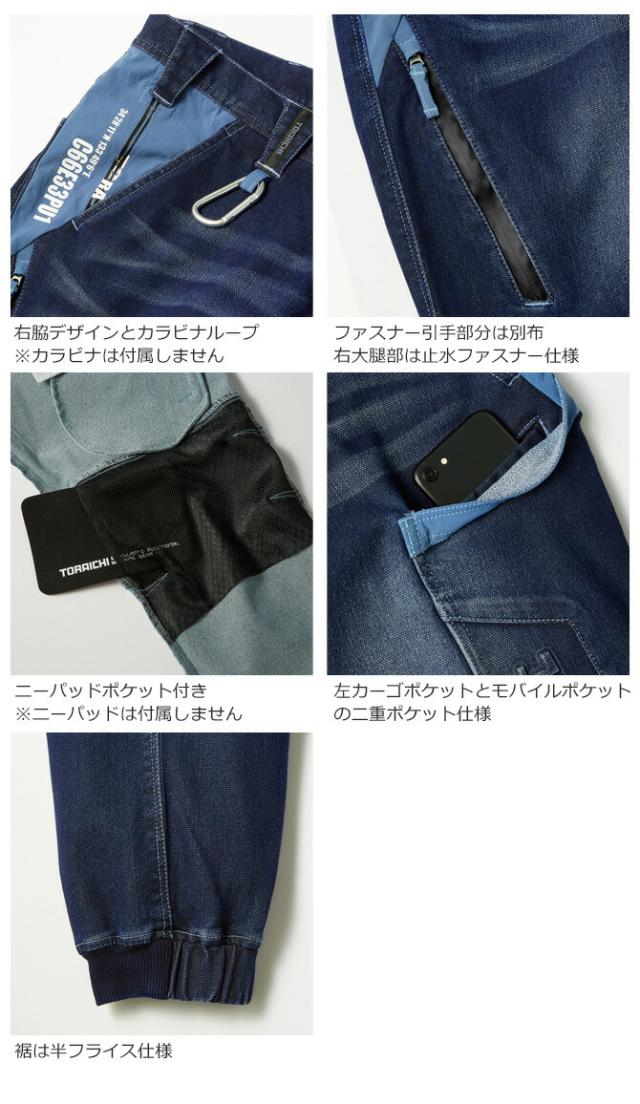 | 寅壱の伸縮率抜群の横伸びストレッチで動きやすいデニムカーゴジョガーパンツです。 遮熱機能を取り入れ、裏面点接触の肌触りが良いので、夏場のお仕事を快適にサポートします。 左カーゴポケットは止水ファスナー付きで、後ろポケットには大容量のスラッシュポケットを装備し、右脇に便利なカラビナループが付いています。 大胆な配色別布の組み合わせは斬新で目を引くポイントで、デザインの特徴と共に部分補強も兼ねています。 | ||||