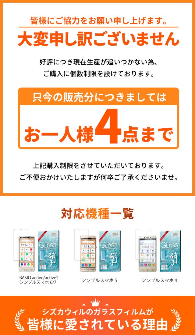 シンプルスマホ7 ガラスフィルム BASIO active2 SHG09 保護フィルム シンプルスマホ6 A201SH フィルム シンプルスマホ5 A001SH シンプルスマホ4 704SH 画面保護フィルム シズカウィル