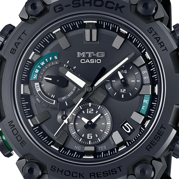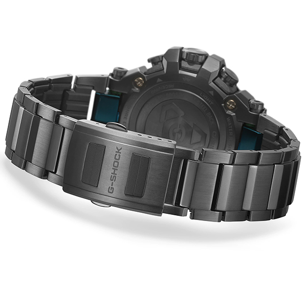 MTG-B3000はカーボン強化樹脂ケースでモジュールを保護し、外側をメタルパーツで覆った「デュアルコアガード構造」を更に進化させました。ステンレス製の裏蓋を、何工程ものプレス、切削、研磨を駆使し立体的な複雑形状に成形。バンドを固定するラグや、りゅうずガード、ボタンガードの機能を裏蓋に持たせるという全く新しい構造とデザインに挑戦し、小型薄型化も実現しています。更に工具無しでバンドの付け替えが簡単にできるワンプッシュ式交換バンド構造を新たに開発。MTG-B3000BDはステンレスとファインレジンにより軽量化したレイヤーコンポジットバンドを採用。メタルパーツにカラーIPコーティングを施し、これまでに無い新鮮なカラーリングになっています。透明度の高いサファイアガラスを採用し、カシオ山形工場の微細加工技術により高い質感に仕上げています。機能面ではBluetooth®通信機能により専用アプリ「CASIO WATCHES」と接続し時刻情報を取得。マルチバンド6とタフソーラー、高輝度なLEDライトも搭載し、実用性も備えました。