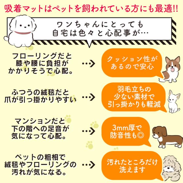 | 注意事項 | ・製造時期によっては若干色味が異なる場合があります。 ・汚れた場合は固く絞った雑巾で拭き取るか、水洗いをしてください。 水分が隙間に入り込んだ場合はカビ発生の原因となる場合がありますので、定期的にマットを剥がして掃除してください。 ・PE樹脂の臭いが最初はある程度しますが、人体には影響ありません。 臭いによる返品はお受けできませんので、臭いの気になる方はその旨をご了承の上ご購入をお願いいたします。 ・重量物を載せますと、マットが凹み変形する恐れがあります。 ・床材との温度差で製品が反る場合があります。 ・商品は、モニターによって色合いが異なって見える場合があります。 ・材質の特性上、厚みに多少の誤差がある場合がございます。あらかじめご了承ください。 ・仕様・デザインは改良のため予告なく変更することがあります。 |