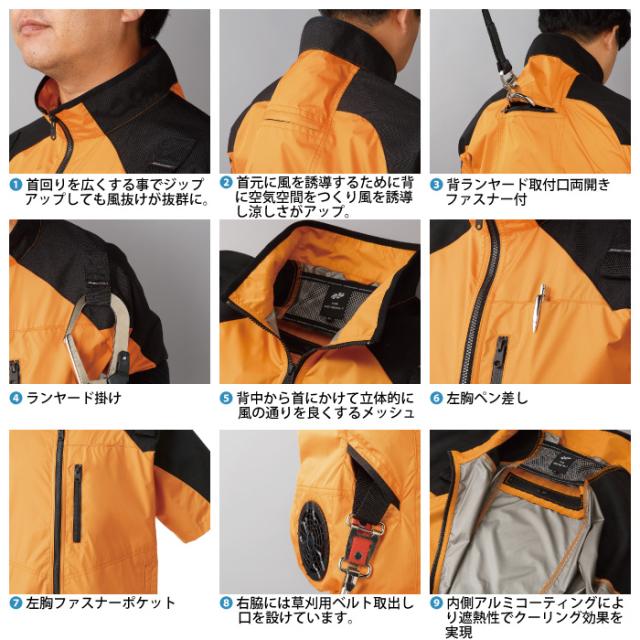 ◇夏の過酷な室外作業を快適にこなすための工夫を随所に備えたハーネス対応半袖ジャンパー。