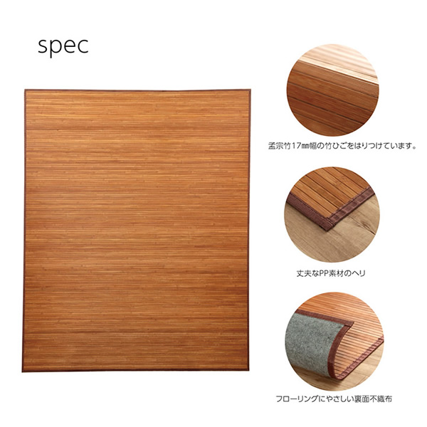 ※写真はメーカー様のカタログ等から掲載させて頂いております。 実物の商品と写真の色が若干写真写り等により異なる場合がありますのでご注意くださいませ。 万が一の際でございましても返品はお受け致しかねます。 ■原産国 中国 ■組成 素材:表地=竹 裏地=不織布 ヘリ=PP ■サイズ 180×220cm ■洗濯表示 洗えません。 ※記載は商品仕様の一部です。仕様説明不足等の理由での返品はできません。特に適合等は必ずご確認ください。