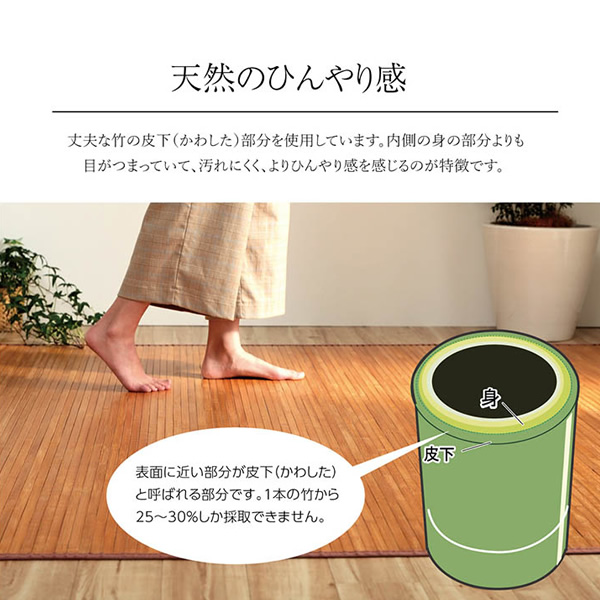 孟宗竹の表面付近の目がぎっしり詰まった部分のみを使用した竹ラグです。