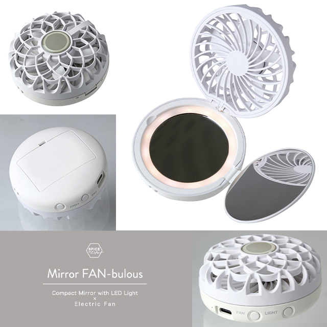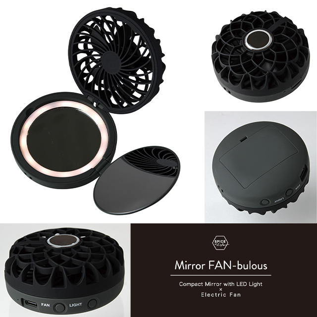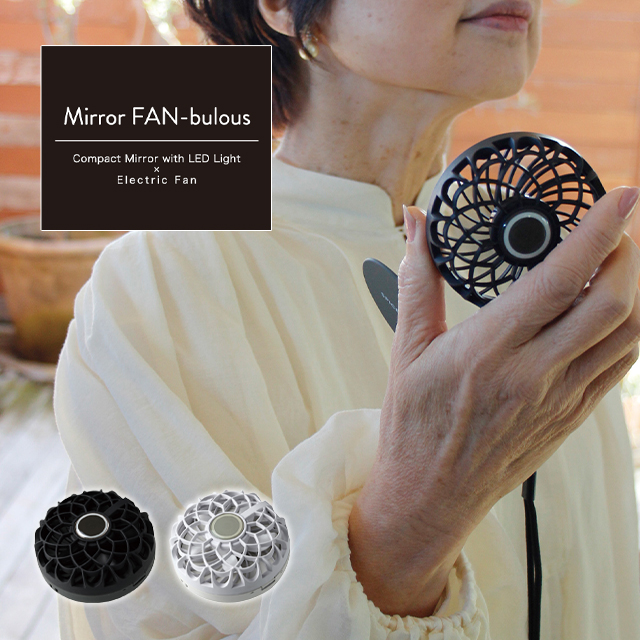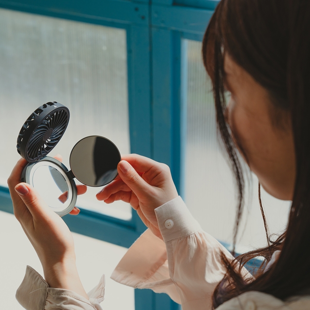 ■コスメのようにいつも持ち歩けることで、お洒落に暑さから身を守り、光ることで、暗闇でも安全に身を守る「Mirror-FAN-bulous(ミラーファンビュラス)」。LED付のコンパクトミラーと一体型になった、フェミニンな小型扇風機です。