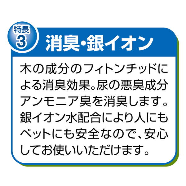 ●環境に優しい:主原料にリサイクル材の木粉を使用しています。リサイクル材を使用することで、循環型社会に貢献します。●小さく固まる:ガッチリ小さく固まるので、お掃除が簡単です。少ない量で固まるので経済的にお使いいただけます。※固まり具合は、愛猫の個体差によって異なります。●消臭・銀イオン:木の成分のフィトンチッドによる消臭効果。尿の悪臭成分アンモニア臭を消臭します。銀イオン水配合により人にもペットにも安全なので、安心してお使いいただけます。●燃やせる:木の粉が主原料ですので、可燃ゴミとして処理できます。