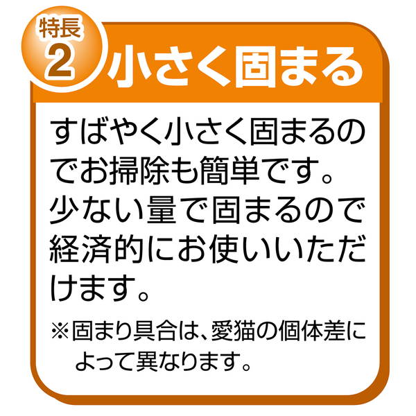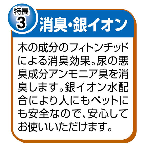 ●環境に優しい:主原料にリサイクル材の木粉を使用。リサイクル材を使用することで循環型社会に貢献。●小さく固まる:すばやく小さく固まるのでお掃除も簡単。少ない量で固まるので経済的。※固まり具合は愛猫の個体差によって異なります。●消臭・銀イオン:木の成分のフィトンチッドによる消臭効果。尿の悪臭成分アンモニア臭を消臭。銀イオン水配合により人にもペットにも安全なので安心してお使いいただけます。●流せる・燃やせる:尿を吸収した部分だけを水洗トイレに流せるので処理も簡単。木粉が主原料なので可燃ゴミとしても処理できます。●ベントナイトフリー:ベントナイト(粘土鉱物)は一切使用していないので軽くて持ち運びにも便利。