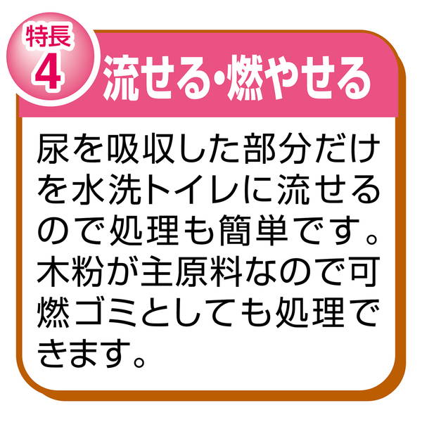 すばやく小さく固まり、水洗トイレに流せるので処理も簡単です。リサイクル材の木粉が主原料なので、環境にも優しくフィトンチッドにより消臭効果もあります。可燃ゴミとしても処理できます。ベントナイト(粘土鉱物)は一切使用していません。1袋でオシッコ約330回分使用可能(1回のオシッコ量20ccの場合)。