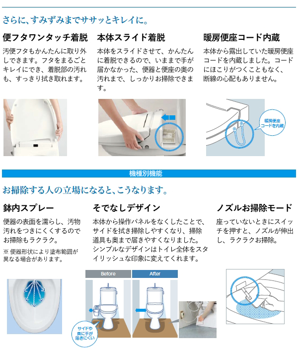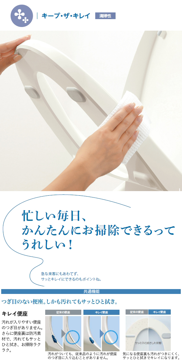 かんたんにお掃除できる、キレイ便座、簡単着脱。
