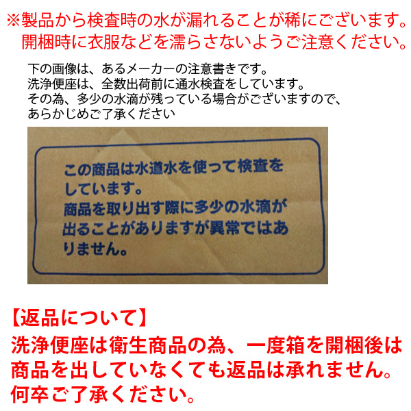 洗浄便座は衛生商品の為、一度箱を開梱後は商品を出していなくても返品は承れません。何卒ご了承ください。あらかじめ製品仕様をよくご確認の上でご注文下さいますようお願いいたします。