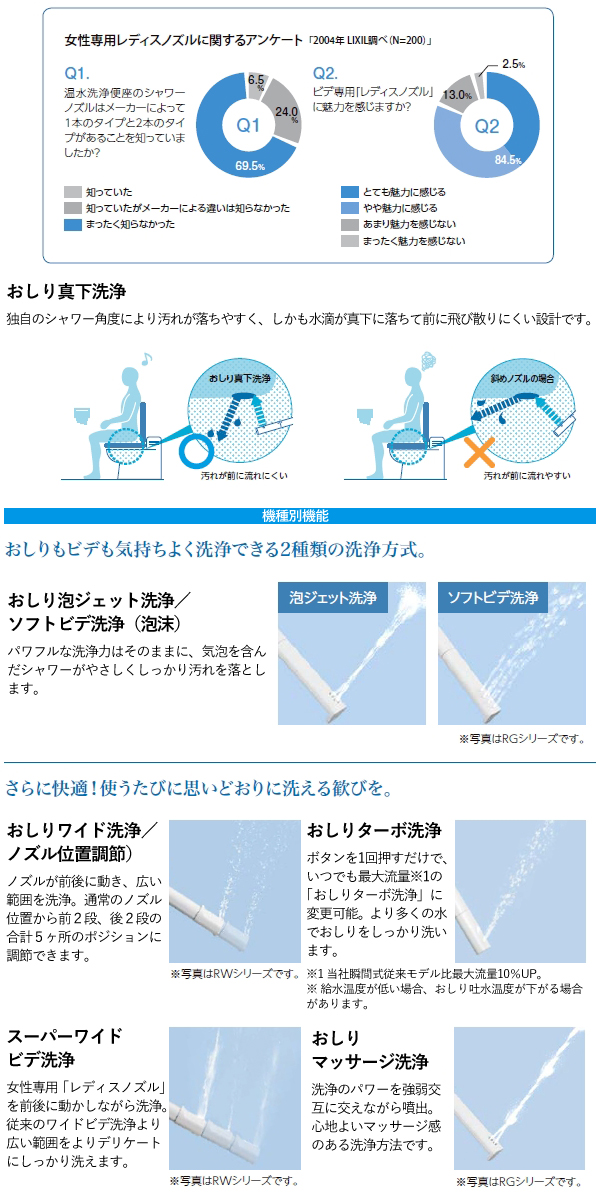 おしり用と女性用、別々のノズルで清潔・安心。2種類の洗浄方式や快適に洗える機能搭載。