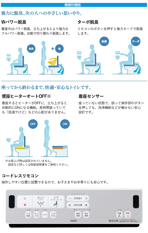 強力な脱臭機能搭載。便座ヒーターオートOFFで長時間でも安心。