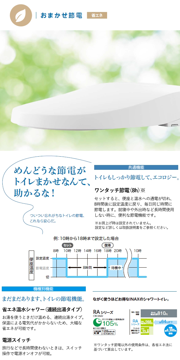| 暖房便座 | 室温・約28〜36℃※2(計5段階切替) ワンタッチ節電(8h)設定時:室温 ヒーター容量:45W 安全装置:温度ヒューズ |