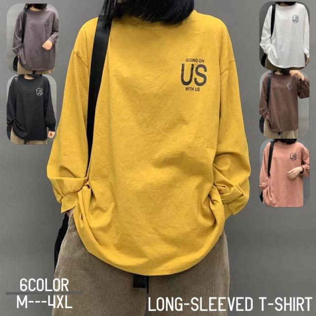 Tシャツ 長袖 レディース ラウンドネック プルオーバー ドロップショルダー 英字 ロゴ プリント ワンポイント ゆったり 大き